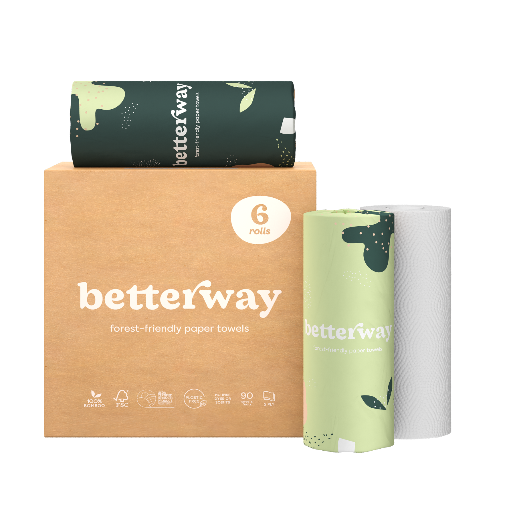 Box of 6 rolls. 90 sheets/roll of 2-Ply, 100% organically grown bamboo.